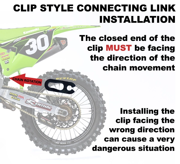 When installing your RK Chain Clip style connecting link – make sure the closed end of the clip is facing the direction of the chain movement. Installing the clip link facing the wrong direction can cause a dangerous situation.